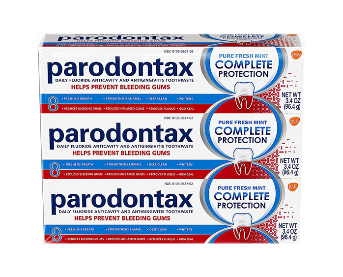 - Three 3.4 oz tubes of Parodontax Complete Protection Gum Toothpaste, Pure Fresh Mint